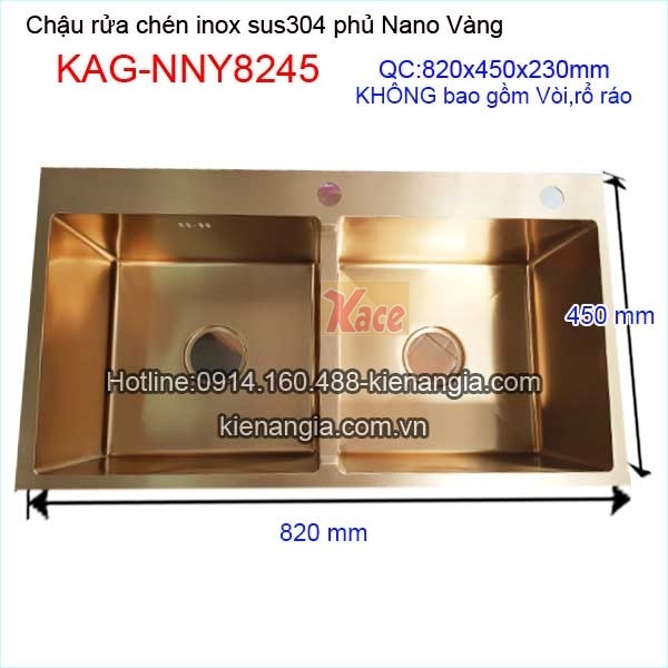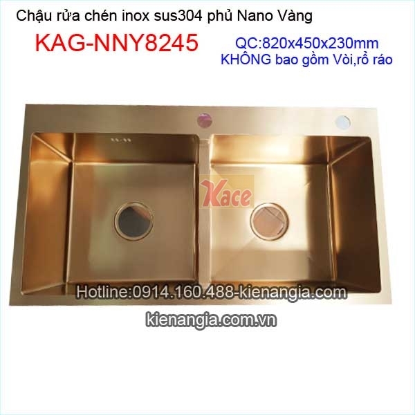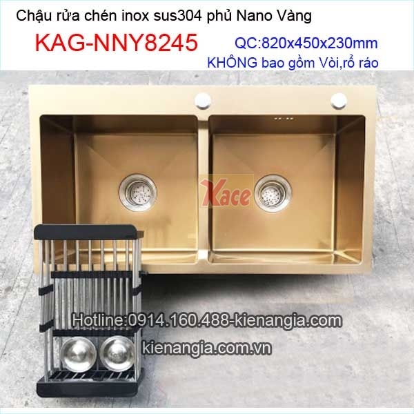 Chậu 2 hộc đều phủ Nano vàng KAG-NNY8245,chậu rửa bát bằng inox sus304 phủ NANO ,công nghệ mới nhất 2019-2020 làm cho bề mặt chậu mịn,bóng,khó bám bẩn,dễ vệ sinh,khó trầy sướt.Bộ xả thoát nước nhanh,chống hôi tốt.Kiểu dáng sang trọng,hiện đại cho bếp 2020,giá tốt KIẾN AN GIA-0914.160.488.Xem Video chậu NANO vàng tại đây