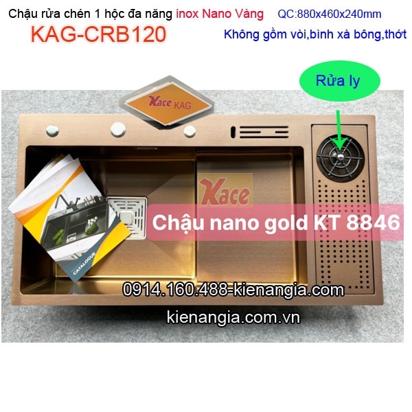 Chậu rửa chén 1 hộc có rửa ly Nano Vàng 88x46cm KAG-CRB120,chậu rửa cao cấp sang trọng, Inox dày 3mm, thành chậu 1.2mm phủ NANO màu Gold,Thiết kế hố chậu sâu để ngăn nước bắn tung tóe. Góc tròn để làm sạch dễ dàng. Bề mặt phủ NANO màu đen chống xước, chống bám dầu mỡ .Si-phông thoát nước ngăn ngừa tắc nghẽn, mùi hôi, vi khuẩn.Gía tốt KIẾN AN GIA-0914.160.488