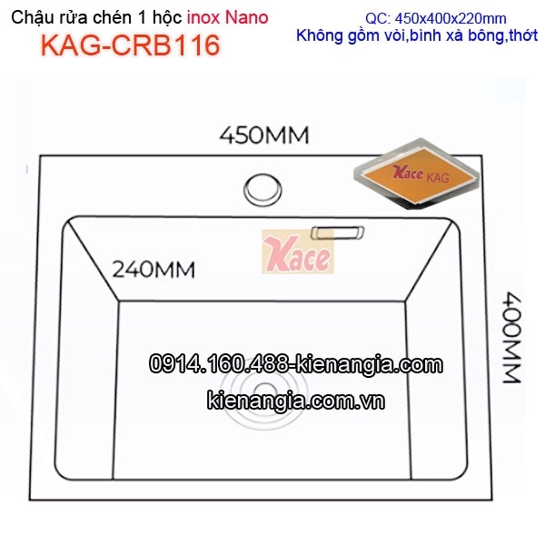 Chậu rửa chén 1 hộc Nano đen 45x40cm KAG-CRB116,chậu rửa cao cấp sang trọng, Inox dày 3mm, thành chậu 1.2mm phủ NANO màu đen,Thiết kế hố chậu sâu để ngăn nước bắn tung tóe. Góc tròn để làm sạch dễ dàng. Bề mặt phủ NANO màu đen chống xước, chống bám dầu mỡ .Si-phông thoát nước ngăn ngừa tắc nghẽn, mùi hôi, vi khuẩn.Gía tốt KIẾN AN GIA-0914.160.488