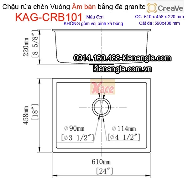Chậu rửa chén âm bàn 1 hộc vuông 61x45cm đá granite Creave KAG-CRB101.Chậu rửa chén bằng đá granite Độ bền sử dụng và tuổi thọ của chậu khá cao,khó trầy xước,Không bám dầu mỡ, chỉ cần dùng giẻ sạch lau nhẹ nhàng là đã có thể vệ sinh chậu luôn như mới.Không thấm nước.Bạn có thể chọn loại chậu 1 hộc,chậi 1 hộc có cánh ,2 hộc hay 2 hộc có cánh có kích thước phù hợp.Chiết khấu cao,giá rẻ tại KIẾN AN GIA-0914.160.488