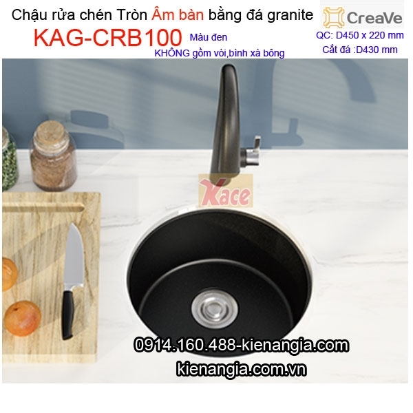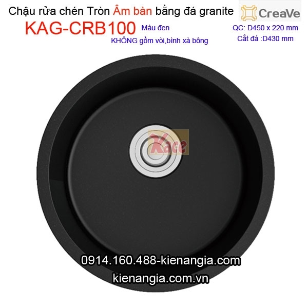 Chậu rửa chén âm bàn tròn đá granite D45cm Creave KAG-CRB100.Chậu rửa chén bằng đá granite Độ bền sử dụng và tuổi thọ của chậu khá cao,khó trầy xước,Không bám dầu mỡ, chỉ cần dùng giẻ sạch lau nhẹ nhàng là đã có thể vệ sinh chậu luôn như mới.Không thấm nước.Bạn có thể chọn loại chậu 1 hộc,chậi 1 hộc có cánh ,2 hộc hay 2 hộc có cánh có kích thước phù hợp.Chiết khấu cao,giá rẻ tại KIẾN AN GIA-0914.160.488.XEM bộ sưu tập Chậu 1 hộc âm bàn đá TẠI ĐÂY