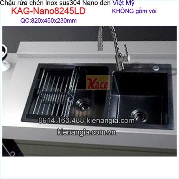 Chậu rửa chén inox sus304 Nano đen 2 hộc Việt Mỹ KAG-Nano8245LD Inox SUS304 cao cấp không gỉ và được bao phủ lớp thêm một lớp Nano giúp kháng khuẩn hỗ trợ bảo vệ tốt nhất cho sức khỏe người dùng, cũng như cho sản phẩm có độ bền hơn với thời gian sử dụng.Chậu Nano đen giá rẻ chiết khấu cao KIẾN AN GIA-0914.160.488