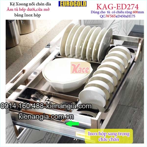 Kệ chén dĩa inox hộp âm tủ 60cm EUROGOLD-KAG-ED274,khay chén dĩa âm tủ bếp dưới,kệ chén dĩa có ray kéo giảm chấn nhẹ nhàng khi sử dụng bằng inox hộp đẹp,sang trọng,tiện lợi giúp cho mọi thứ ngăn nắp,gọn gàng,tận dụng tối đa không gian tủ bếp.Bạn chú ý chọn kệ có qui cách phù hợp tủ bếp gồm phủ bì cánh tủ 60cm,70cm,75cm,80cm,90 cm loại gắn cánh (mở cánh đồng thời kéo kệ ),hay âm tủ (cánh tủ mở trước,kéo kệ ra sau ),chiết khấu cao KIẾN AN GIA-0914.160.488