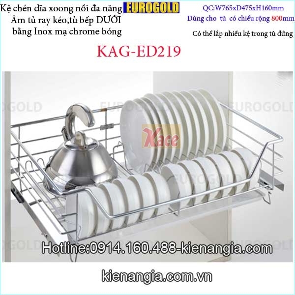 Kệ chén dĩa xoong nồi 800 EUROGOLD âm cánh tủ KAG-ED219 tủ bếp dưới ,giá bát đĩa âm cánh tủ có ray kéo giảm chấn,kệ chén dĩa đa năng âm tủ bếp dưới,khay inox úp chén dĩa,ly,xong nồi...đa năng sản xuất theo tiêu chuẩn châu Âu hiện đại phù hợp qui cách tủ 600,700,750,800,900 chiết khấu cao KIẾN AN GIA-0914.160.488,dễ lắp đặt,tiện lợi cho người dùng,dễ lau chùi ,bảo quản vật dụng nhà bếp luôn sạch boong,gọn gàng.Có thể lắp nhiều kệ trong tủ đứng tha hồ sử dụng