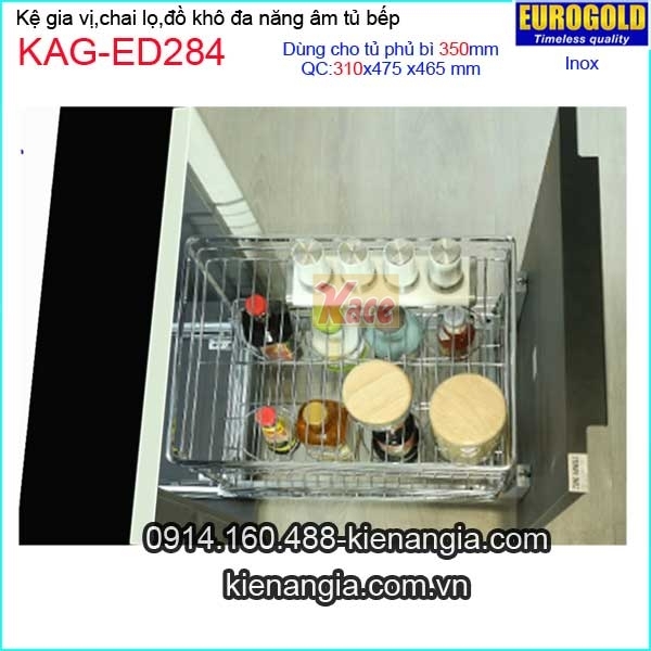 Kệ gia vị,chai lọ inox âm tủ 35cm EUROGOLD-KAG-ED284,giá gia vị ,chai lọ đa năng bằng inox sáng bóng âm tủ bếp,ray giảm chấn nhẹ nhàng khi sử dụng,gắn vào cánh tủ hoặc gắn vào tủ,cánh tủ mở tùy theo thiết kế.Lưu ý chọn kệ có kích thước phù hợp tủ (có ghi trên hình sản phẩm).Có nhiều qui cách để chọn kệ gia vị cho tủ 20cm,tủ 250mm,tủ 300mm,tủ 35cm,tủ 40cm.Kệ tủ bếp EUROGOLD chính hãng chiết khấu cao KIẾN AN GIA-0914.160.488