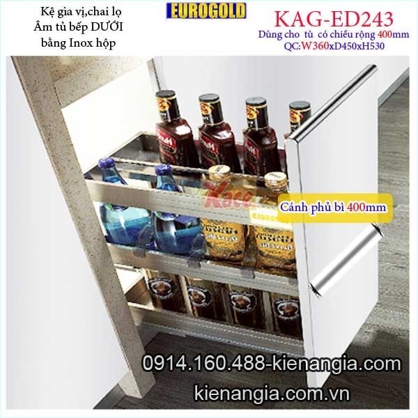Kệ gia vị chai lọ inox hộp tủ 400 EUROGOLD-KAG-ED243,khay gia vị đa năng âm tủ bếp dưới,kệ đa năng gia vị có rat kéo gắn cánh cửa tủ tiện dụng,giúp nhà bếp luôn gọn gàng.Tiện nghi cho cuộc sống hiện đại năng động thời @,có các kích thước kệ gia vị tủ 200mm,tủ 250mm,tủ 30cm,tủ 35cm và tủ 40 cm .Nhiều qui cách kệ gia vị,kệ xoong nồi,kệ chén dĩa tại KIẾN AN GIA-0914.160.488