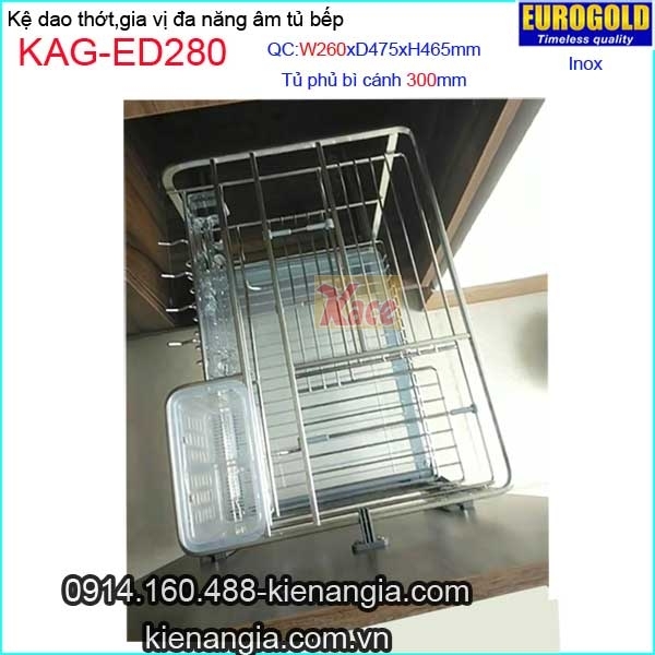Kệ gia vị,dao thớt inox âm tủ 30cm EUROGOLD-KAG-ED280,giá dao thớt,gia vị đa năng bằng inox sáng bóng âm tủ bếp,ray giảm chấn nhẹ nhàng khi sử dụng,gắn vào cánh tủ hoặc gắn vào tủ,cánh tủ mớ tùy theo thiết kế.Lưu ý chọn kệ có kích thước phù hợp tủ (có ghi trên hình sản phẩm).Có nhiều qui cách để chọn kệ gia vị cho tủ 20cm,tủ 250mm,tủ 300mm,tủ 35cm,tủ 40cm.Kệ tủ bếp EUROGOLD chính hãng chiết khấu cao KIẾN AN GIA-0914.160.488