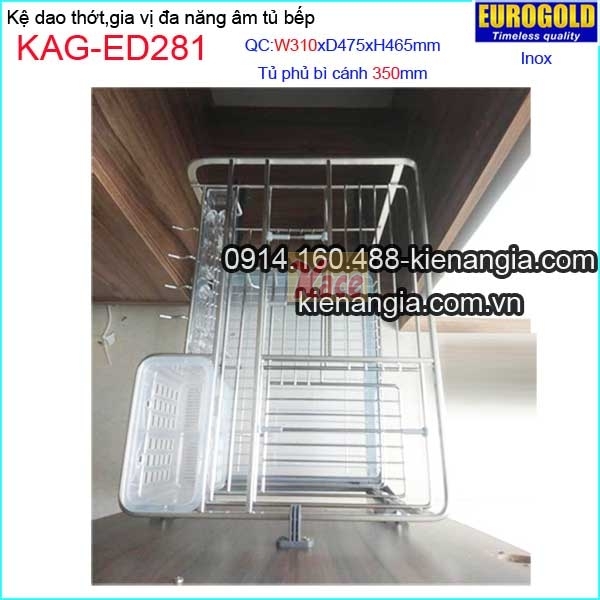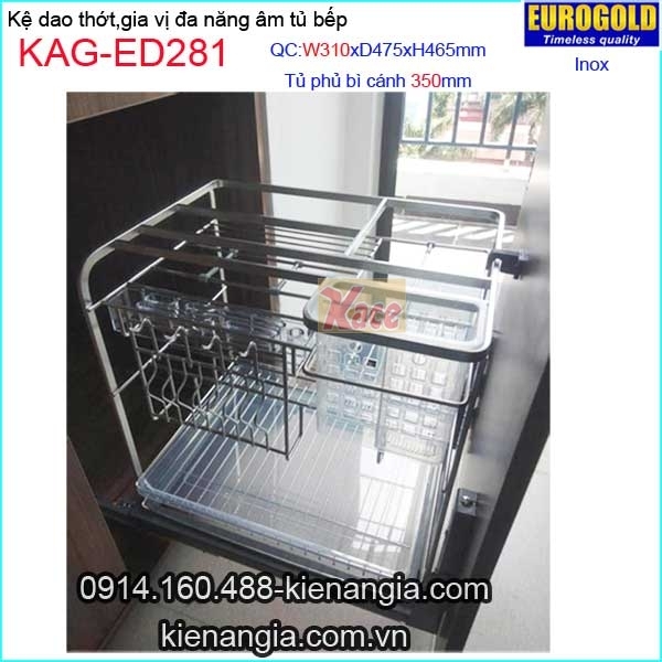 Kệ gia vị,dao thớt inox âm tủ 35cm EUROGOLD-KAG-ED281,giá dao thớt,gia vị đa năng bằng inox sáng bóng âm tủ bếp,ray giảm chấn nhẹ nhàng khi sử dụng,gắn vào cánh tủ hoặc gắn vào tủ,cánh tủ mớ tùy theo thiết kế.Lưu ý chọn kệ có kích thước phù hợp tủ (có ghi trên hình sản phẩm).Có nhiều qui cách để chọn kệ gia vị cho tủ 20cm,tủ 250mm,tủ 300mm,tủ 35cm,tủ 40cm.Kệ tủ bếp EUROGOLD chính hãng chiết khấu cao KIẾN AN GIA-0914.160.488