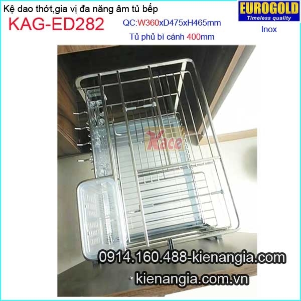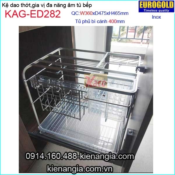 Kệ gia vị,dao thớt inox âm tủ 40cm EUROGOLD-KAG-ED282,giá dao thớt,gia vị đa năng bằng inox sáng bóng âm tủ bếp,ray giảm chấn nhẹ nhàng khi sử dụng,gắn vào cánh tủ hoặc gắn vào tủ,cánh tủ mớ tùy theo thiết kế.Lưu ý chọn kệ có kích thước phù hợp tủ (có ghi trên hình sản phẩm).Có nhiều qui cách để chọn kệ gia vị cho tủ 20cm,tủ 250mm,tủ 300mm,tủ 35cm,tủ 40cm.Kệ tủ bếp EUROGOLD chính hãng chiết khấu cao KIẾN AN GIA-0914.160.488