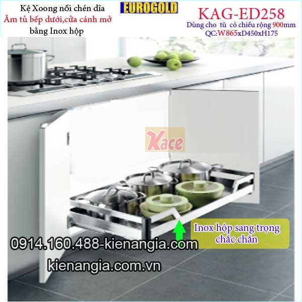Kệ xoong nồi chén dĩa inox hộp âm tủ 90cm EUROGOLD-KAG-ED258,khay xoong nồi,chén dĩa âm tủ bếp dưới,kệ xoong nồi chén dĩa có ray kéo giảm chấn nhẹ nhàng khi sử dụng bằng inox hộp đẹp,sang trọng,tiện lợi giúp cho mọi thứ ngăn nắp,gọn gàng,tận dụng tối đa không gian tủ bếp.Bạn chú ý chọn kệ có qui cách phù hợp tủ bếp gồm phủ bì cánh tủ 60cm,70cm,75cm,80cm,90 cm loại gắn cánh (mở cánh đồng thời kéo kệ ),hay âm tủ (cánh tủ mở trước,kéo kệ ra sau ),chiết khấu cao KIẾN AN GIA-0914.160.488