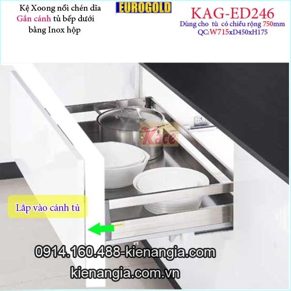 Kệ xoong nồi chén dĩa inox hộp gắn cánh tủ 75cm EUROGOLD-KAG-ED246,khay xoong nồi,chén dĩa âm tủ bếp dưới,kệ xoong nồi chén dĩa có ray kéo giảm chấn nhẹ nhàng khi sử dụng bằng inox hộp đẹp,sang trọng,tiện lợi giúp cho mọi thứ ngăn nắp,gọn gàng,tận dụng tối đa không gian tủ bếp.Bạn chú ý chọn kệ có qui cách phù hợp tủ bếp gồm phủ bì cánh tủ 60cm,70cm,75cm,80cm,90 cm loại gắn cánh (mở cánh đồng thời kéo kệ ),hay âm tủ (cánh tủ mở trước,kéo kệ ra sau ),chiết khấu cao KIẾN AN GIA-0914.160.488