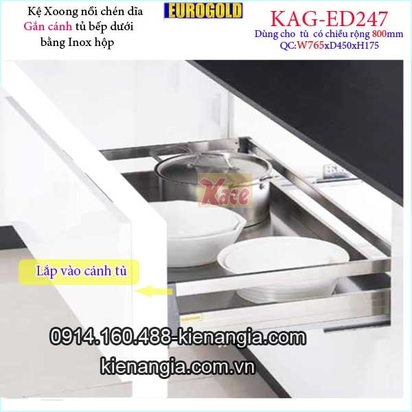 Kệ xoong nồi chén dĩa inox hộp gắn cánh tủ 80cm EUROGOLD-KAG-ED247,khay xoong nồi,chén dĩa âm tủ bếp dưới,kệ xoong nồi chén dĩa có ray kéo giảm chấn nhẹ nhàng khi sử dụng bằng inox hộp đẹp,sang trọng,tiện lợi giúp cho mọi thứ ngăn nắp,gọn gàng,tận dụng tối đa không gian tủ bếp.Bạn chú ý chọn kệ có qui cách phù hợp tủ bếp gồm phủ bì cánh tủ 60cm,70cm,75cm,80cm,90 cm loại gắn cánh (mở cánh đồng thời kéo kệ ),hay âm tủ (cánh tủ mở trước,kéo kệ ra sau ),chiết khấu cao KIẾN AN GIA-0914.160.488