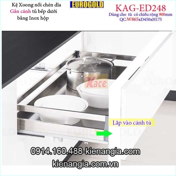 Kệ xoong nồi chén dĩa inox hộp gắn cánh tủ 90cm -EUROGOLD-KAG-ED248,khay xoong nồi,chén dĩa âm tủ bếp dưới,kệ xoong nồi chén dĩa có ray kéo giảm chấn nhẹ nhàng khi sử dụng bằng inox hộp đẹp,sang trọng,tiện lợi giúp cho mọi thứ ngăn nắp,gọn gàng,tận dụng tối đa không gian tủ bếp.Bạn chú ý chọn kệ có qui cách phù hợp tủ bếp gồm phủ bì cánh tủ 60cm,70cm,75cm,80cm,90 cm loại gắn cánh (mở cánh đồng thời kéo kệ ),hay âm tủ (cánh tủ mở trước,kéo kệ ra sau ),chiết khấu cao KIẾN AN GIA-0914.160.488
