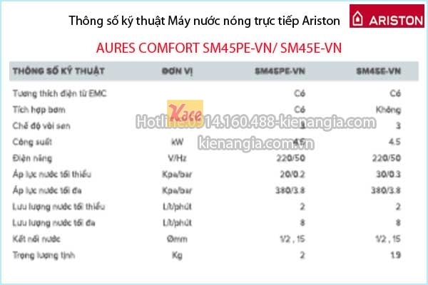 Máy nước nóng không bơm Ariston AURES-COMFORT KAG-SM45E-VN công nghệ đột phá,thương hiệu Ý chính hãng chiết khấu cao KIẾN AN GIA.Máy nước nóng trực tiếp,làm nóng cực nhanh,nhiệt độ ổn định,an toàn cao ,tiện nghi ,siêu mỏng và hiện đại cho gia đình,nhà phố,căn hộ,khách sạn.....Bạn có thể chọn lựa bình nước nóng gián tiếp Ferroli,Ariston...dung tích từ 15 đến 100 lít giá tốt tại 0914160488