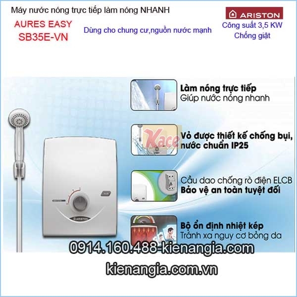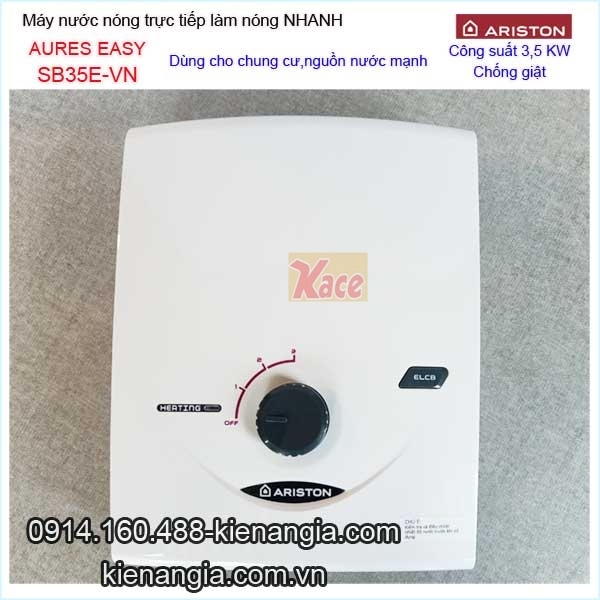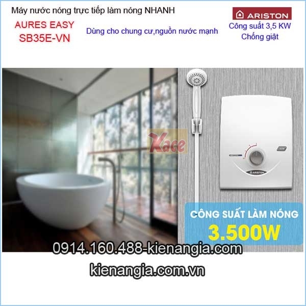 Máy nước nóng không bơm Ariston AURES-EASY KAG-SB35EVN công nghệ đột phá,thương hiệu Ý chính hãng chiết khấu cao KIẾN AN GIA.Máy nước nóng trực tiếp,làm nóng cực nhanh,nhiệt độ ổn định,an toàn cao ,tiện nghi ,siêu mỏng và hiện đại cho gia đình,nhà phố,căn hộ,khách sạn.....Bạn có thể chọn lựa bình nước nóng gián tiếp Ferroli,Ariston...dung tích từ 15 đến 100 lít giá tốt tại 0914160488