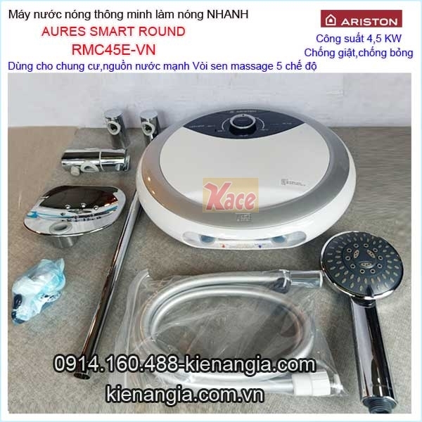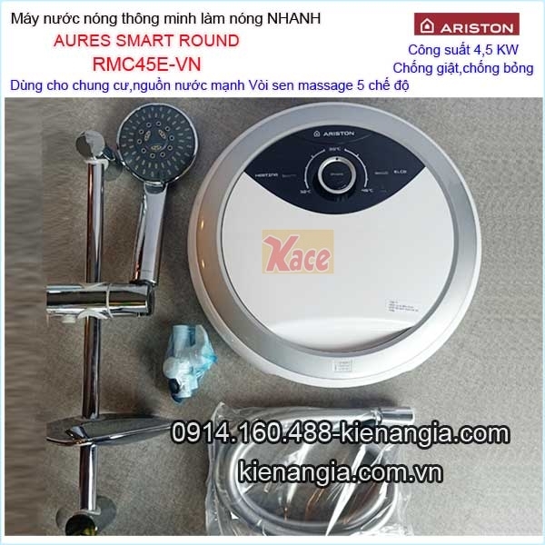 Máy nước nóng không bơm Ariston AURES-SMART-ROUND KAG-RMC45E-VN công nghệ đột phá,thương hiệu Ý chính hãng chiết khấu cao KIẾN AN GIA.Máy nước nóng trực tiếp,làm nóng cực nhanh,nhiệt độ ổn định,an toàn cao ,tiện nghi ,siêu mỏng và hiện đại cho gia đình,nhà phố,căn hộ,khách sạn.....Bạn có thể chọn lựa bình nước nóng gián tiếp Ferroli,Ariston...dung tích từ 15 đến 100 lít giá tốt tại 0914160488
