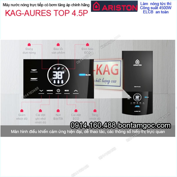 Máy nước nóng màu đen có bơm cảm ứng Ariston chính hãng KAG-AURES TOP 4.5P hiển thị nhiệt độ ,Công suất làm nóng mạnh mẽ 4500W.Tích hợp hệ thống an toàn đồng bộ,tiết kiệm đến 22% điện năng cho gia đình chiết khấu cao KIẾN AN GIA-0914160488.Xe, clIp sản phẩm TẠI ĐÂY