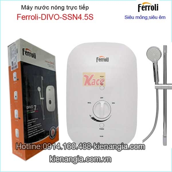 Máy nước nóng trực tiếp FerroliKAG-DIVO-SSN 4.5S chính hãng chiết khấu cao KIẾN AN GIA an toàn cho người dùng,tiết kiệm điện,siêu mỏng rất đẹp.Bạn có thể chọn Máy nước nóng trực tiếp FERROLI có bơm tăng áp siêu êm khi nguồn nước yếu ,máy nước nóng FERROLI đa nhiệm kết hợp đun nóng trực tiếp và cấp nước cho sen vòi,vòi bếp,bình nóng lạnh FERROLI dung tích từ 15 lít trở lên cho bồn tắm...XEM CLIP SẢN PHẨM THẬT ĐÂY