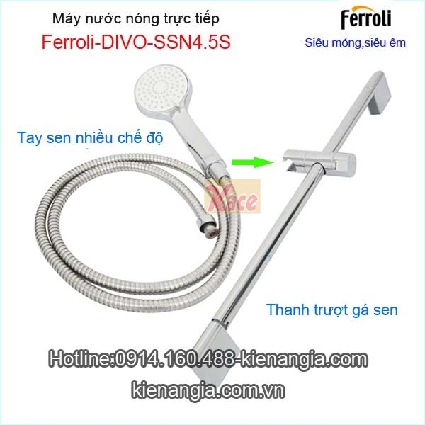 Máy nước nóng trực tiếp FerroliKAG-DIVO-SSN 4.5S ​chính hãng chiết khấu cao KIẾN AN GIA an toàn cho người dùng,tiết kiệm điện,siêu mỏng rất đẹp.Bạn có thể chọn Máy nước nóng trực tiếp FERROLI có bơm tăng áp siêu êm khi nguồn nước yếu ,máy nước nóng FERROLI đa nhiệm kết hợp đun nóng trực tiếp và cấp nước cho sen vòi,vòi bếp,bình nóng lạnh FERROLI dung tích từ 15 lít trở lên cho bồn tắm...XEM CLIP SẢN PHẨM THẬT ĐÂY