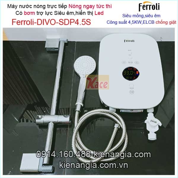 Máy nước nóng trực tiếp có bơm Ferroli KAG-DIVO-SDP 4.5S chính hãng chiết khấu cao KIẾN AN GIA an toàn cho người dùng,tiết kiệm điện,siêu mỏng rất đẹp.Bạn có thể chọn Máy nước nóng trực tiếp FERROLI có bơm tăng áp siêu êm khi nguồn nước yếu ,máy nước nóng FERROLI đa nhiệm kết hợp đun nóng trực tiếp và cấp nước cho sen vòi,vòi bếp,bình nóng lạnh FERROLI dung tích từ 15 lít trở lên cho bồn tắm...XEM CLIP SẢN PHẨM THẬT TẠI ĐÂY