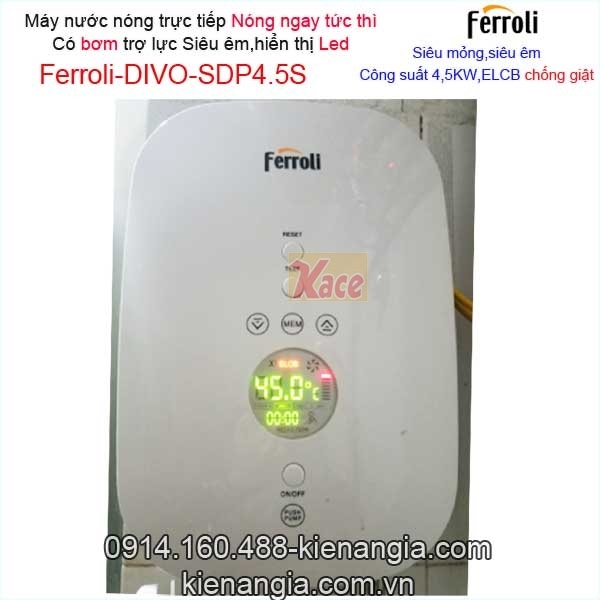 Máy nước nóng trực tiếp có bơm Ferroli KAG-DIVO-SDP 4.5S chính hãng chiết khấu cao KIẾN AN GIA an toàn cho người dùng,tiết kiệm điện,siêu mỏng rất đẹp.Bạn có thể chọn Máy nước nóng trực tiếp FERROLI có bơm tăng áp siêu êm khi nguồn nước yếu ,máy nước nóng FERROLI đa nhiệm kết hợp đun nóng trực tiếp và cấp nước cho sen vòi,vòi bếp,bình nóng lạnh FERROLI dung tích từ 15 lít trở lên cho bồn tắm...XEM CLIP SẢN PHẨM THẬT TẠI  ĐÂY